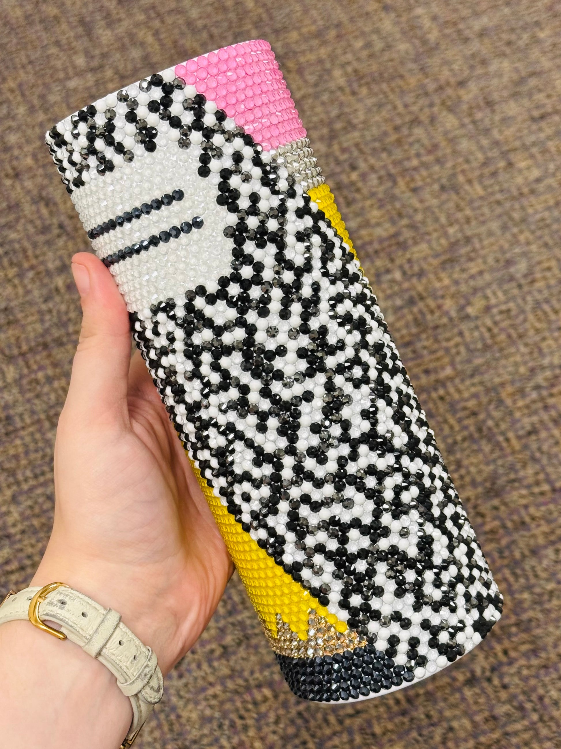 This is a 24 oz. Stainless steel tumbler with rhinestones applied in a back to school design in a honeycomb method.